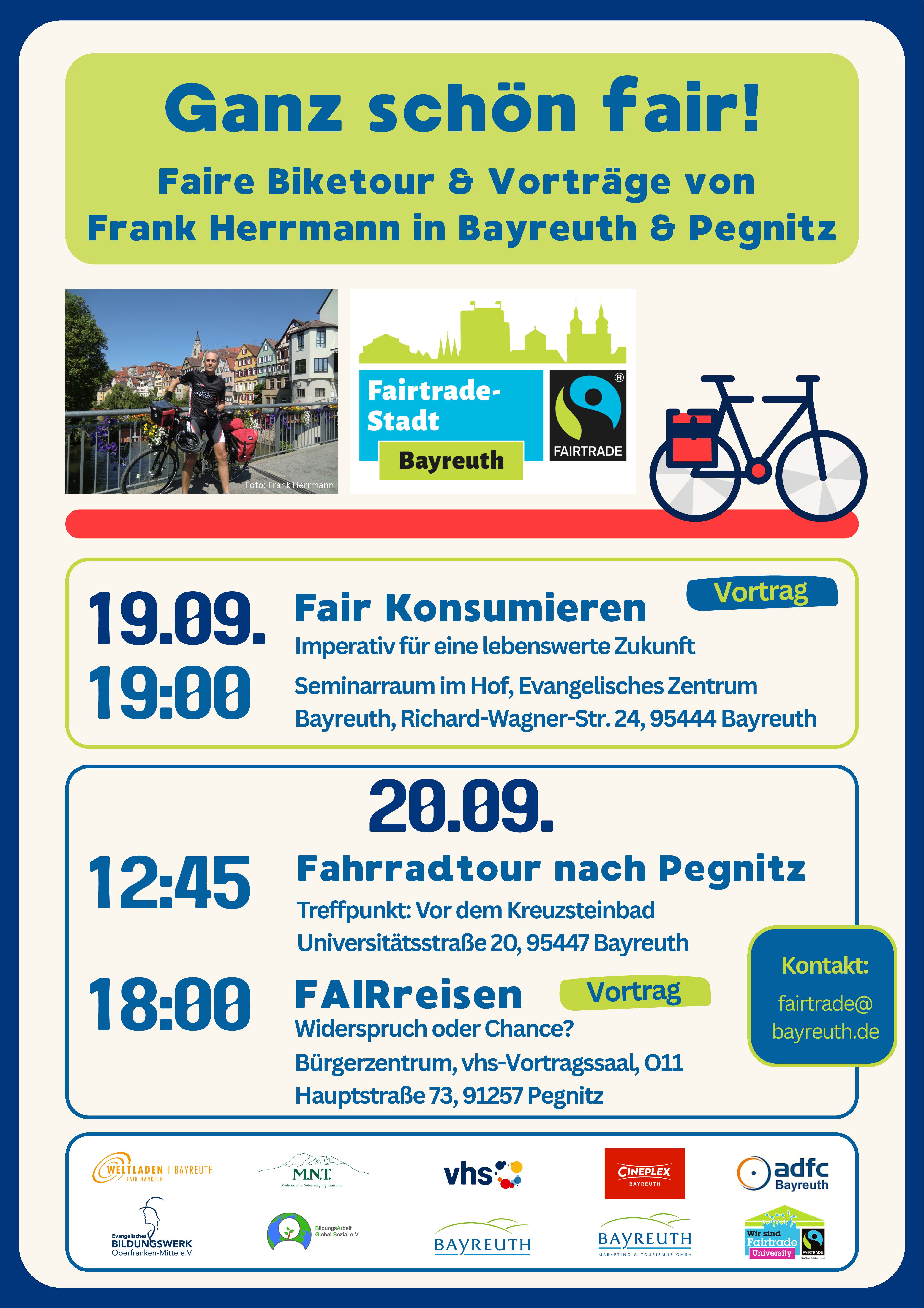 Der Vortrag findet im Rahmen der Fairen Biketour 2025 sowie der Fairen Wochen in Bayreuth statt. Ort: Seminarraum im Hof, Evangelisches Zentrum Bayreuth, Richard-Wagner-Str. 24, 95444 Bayreuth, es referiert Frank Herrmann, Autor, Blogger, Fairer Biker