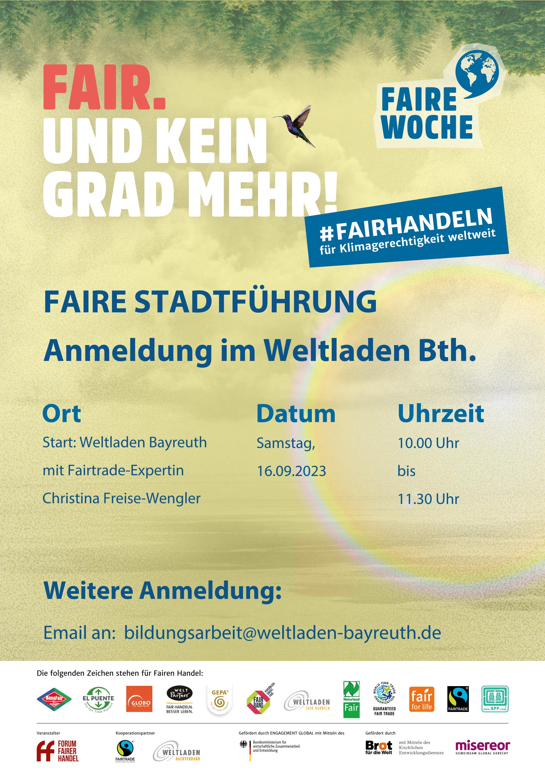 Während eines Rundgangs durch die Bayreuther Innenstadt werden einzelne Themen und Produkte aus dem Bereich des fairen Handelns besprochen und verschiedene Orte und Geschäfte aufgesucht, die fair gehandelte Waren verkaufen. Bitte melden Sie sich an.